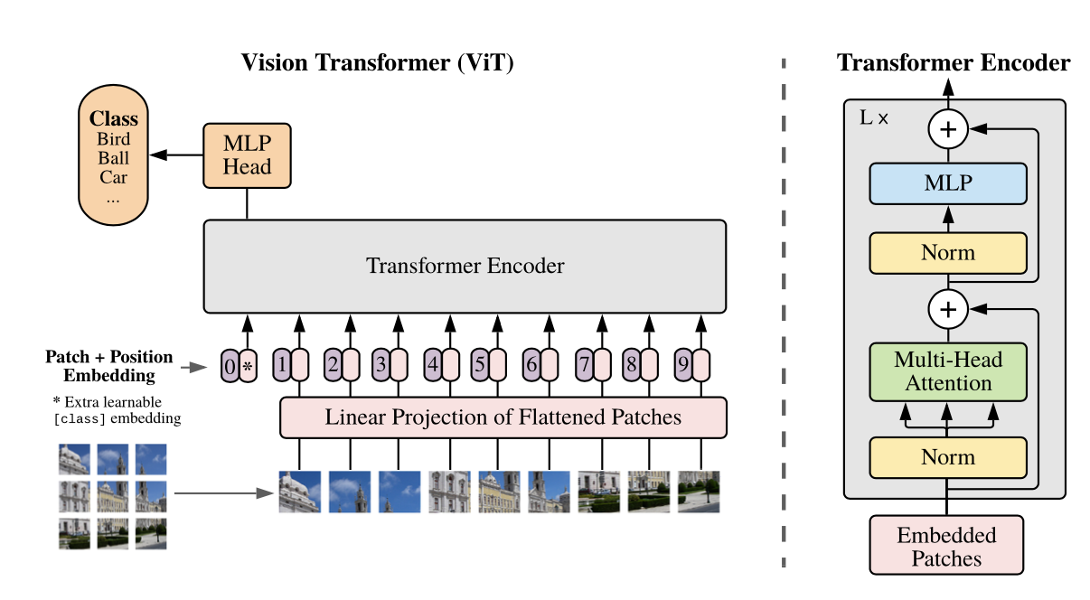 model 구상은 위와 같습니다. Image를 고정된 크기로 분할하고, position embedding을 더해줍니다. 이렇게 구성된 조각을 Transformer Encoder의 입력단으로 넣어줍니다.