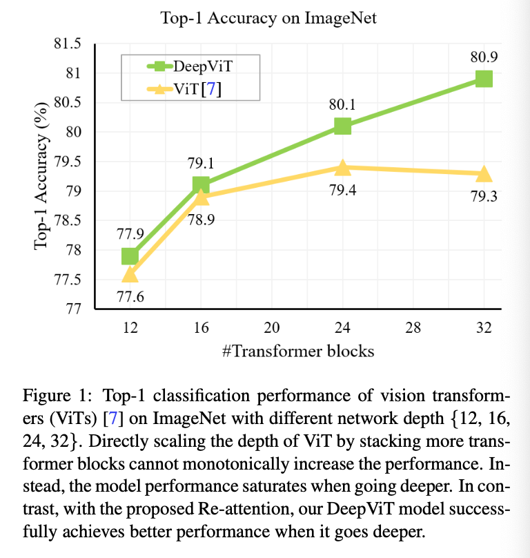 위의 그래프와 표를 보면, embedding demension이 증가하면, accuaracy가 증가하고, similar block의 수가 줄어들지만 parameter의 수는 제곱으로 늘어남을 볼 수 있다. 이 현상을 응욯애서 self-attention의 hidden dimension을 증가시키고, novel re-attention mechanism을 적용시킴으로써 새로운 모델을 제안한다.