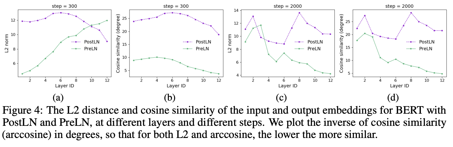 -> PostLN이 layers 별로 매우 다른, 새로운 representation을 생성하려고 할때, PreLN의 dissimilarity가 줄어드는 모습(upper layer들이 비슷한 estimation을 가지고 있다.) 는 것을 의미.